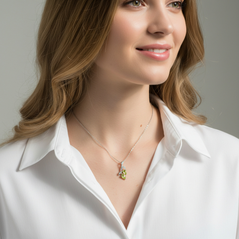 Par la forme et la couleur, la nature est mise à l'honneur sur ce pendentif. Il dessine deux branches avec des feuilles. Les branches tendent vers le bas avec une légère courbure pour donner du design à ce bijou. Elles sont parachevées par un péridot en forme de poire. Des griffes maintiennent la pierre avec délicatesse. La feuille située plus haut est sertie d'un diamant qui rehausse la brillance de la monture en or blanc de ce joli bijou.