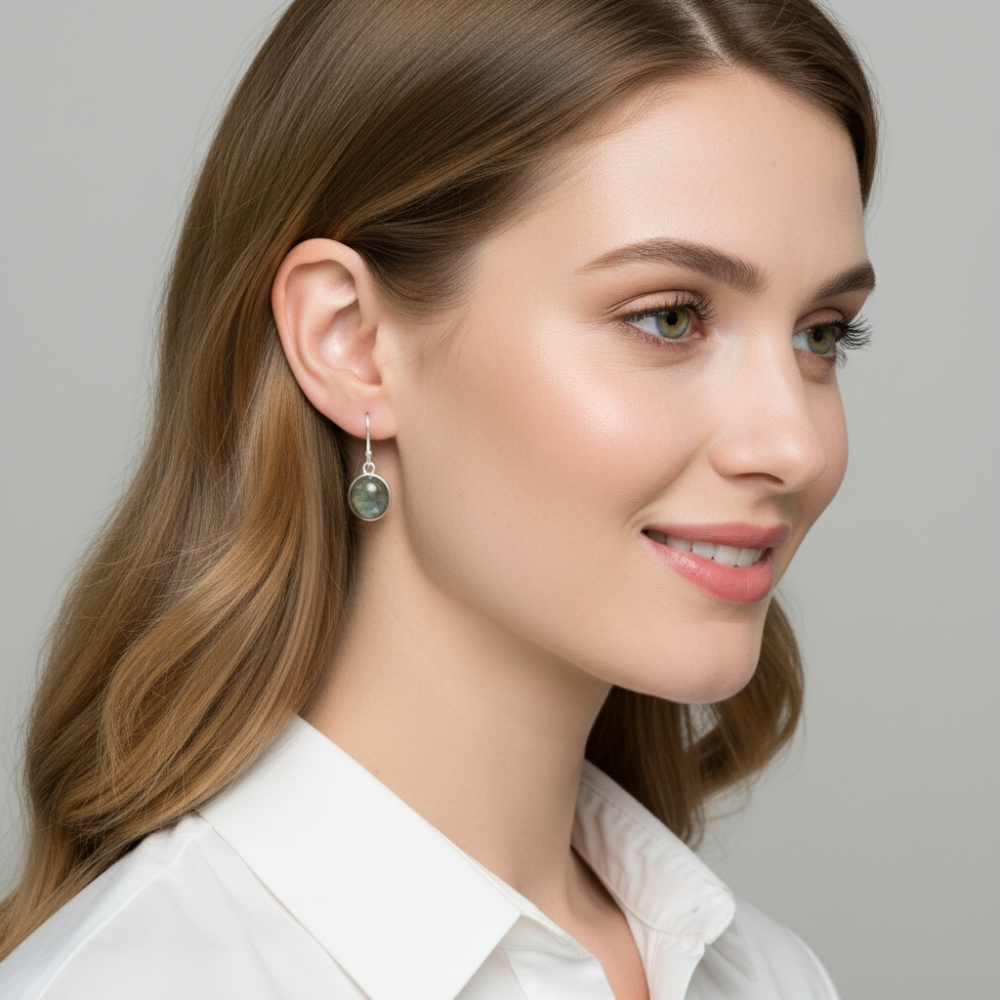 La labradorite serait une pierre de protection pour celles qui croiraient aux bienfaits des pierres. Ici, elle orne des boucles d'oreilles pendantes, elle est de forme ronde et taillée en cabochon. La pierre est montée en serti clos sur chaque motif et laisse apparaître sa face lisse et brillante. Le motif est fixé au crochet pendant qui sert de système de fermeture sur chaque boucle. La monture de ces bijoux est entièrement en argent et elle présente une ligne satinée.