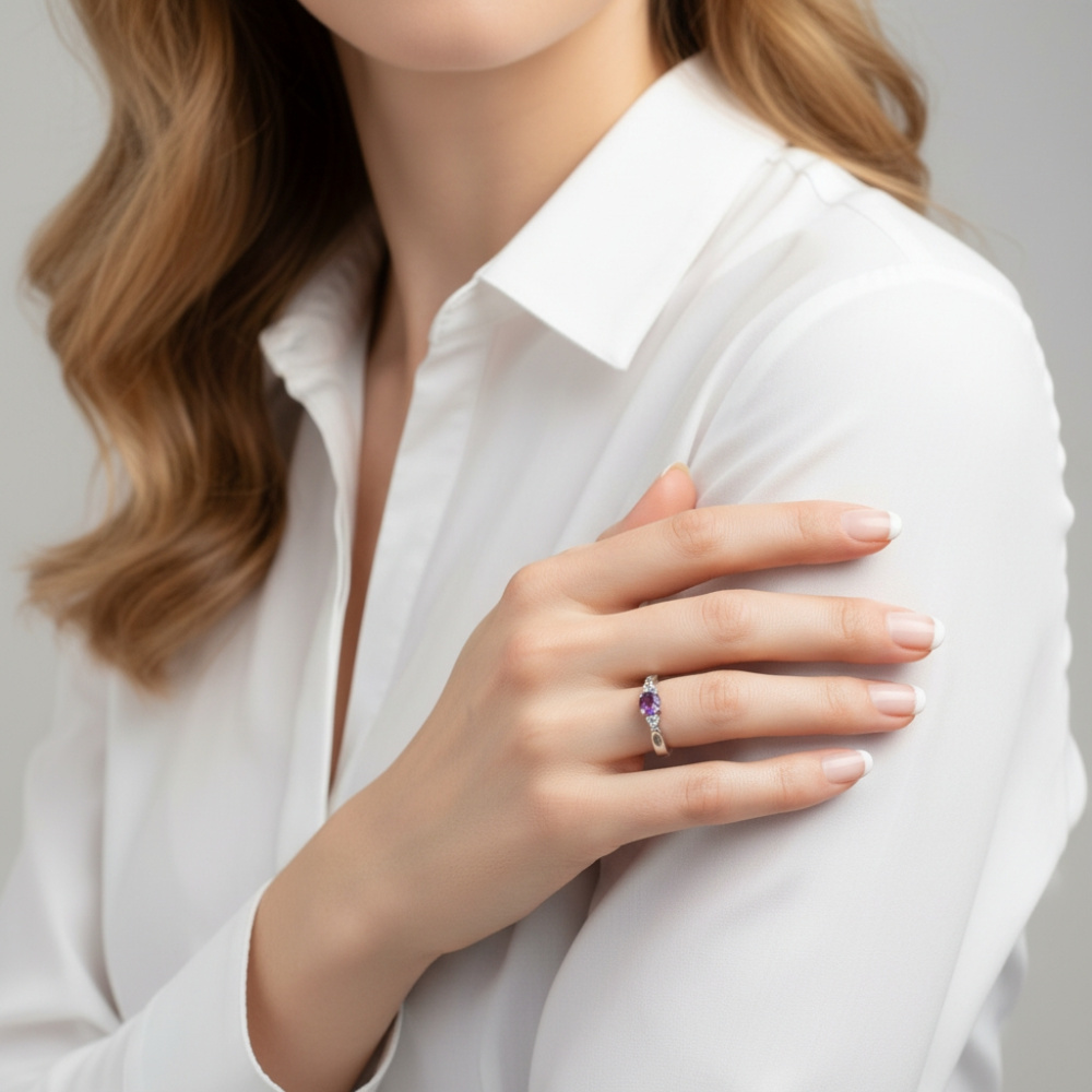 Pour être belle jusqu'au bout des doigts, choisissez cette jolie bague. Son style s'adaptera à vos tenues de tous les jours. Elle est composée d'un anneau classique en argent avec des bords plats. Sur le haut, elle est ornée d'un beau motif, une pierre centrale ronde entourée de chaque côté par un oxyde de zirconium rond. La pierre au milieu est une améthyste, elle est taillée en plusieurs facettes. Les trois pierres qui agrémentent ce bijou sont maintenues par des griffes, un sertissage qui met en valeur leur beauté. On note également un motif ajouré de forme ovale sur l'anneau de chaque côté des pierres.