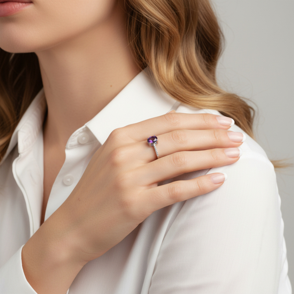 Solitaire Argent Rhodié Améthyste Ovale 7x5mm