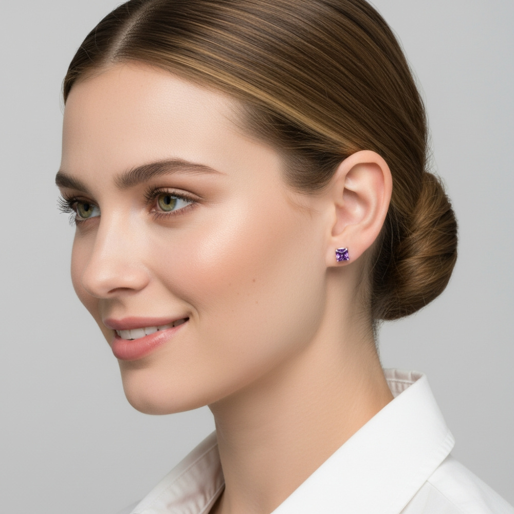 Puces d'oreilles Argent Rhodié Améthyste Coussin 5x5mm