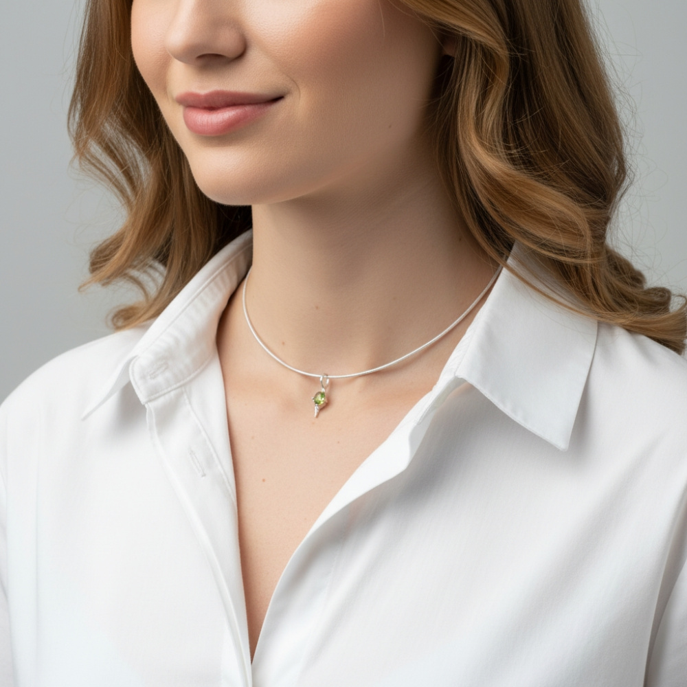 Choisissez ce joli pendentif pour apporter une petite note colorée à votre haut. En effet, il est orné d'un péridot ovale. Cette pierre se dénote par sa belle couleur, du vert jaune qui révèle une teinte printanière. Sur ce bijou, la pierre est accompagnée par une monture en argent rhodié, un bon choix fait par nos bijoutiers pour mettre en avant la couleur de la pierre. La monture accueille la pierre dans un corps à griffes, légèrement penché. Elle dessine un corps longiligne vers le bas d'un côté et de l'autre, il se prolonge vers le haut pour former la bélière.