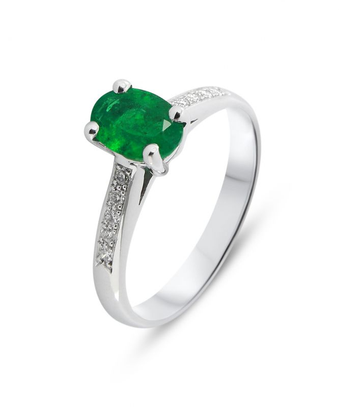 Bague Or Blanc 750 Emeraude Ovale 7x5mm et Diamants