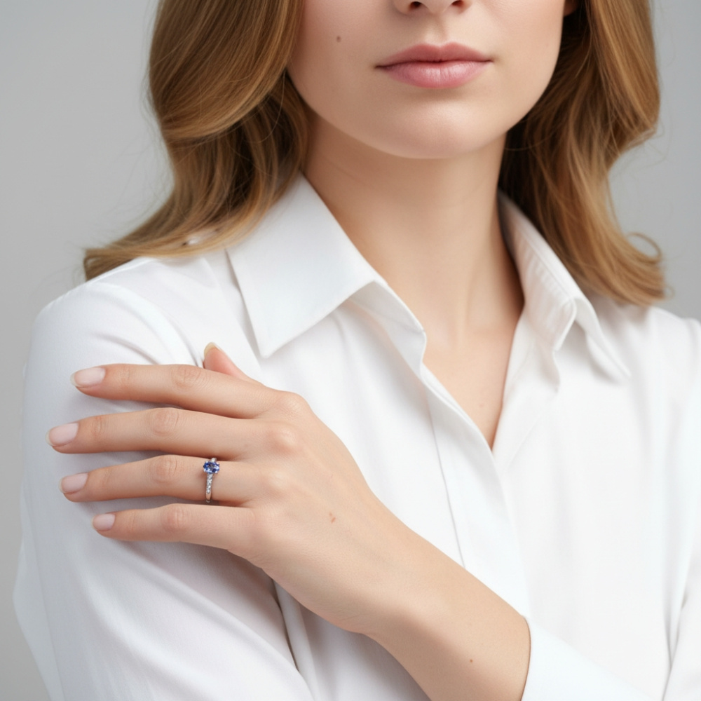 À l'occasion de votre anniversaire de mariage ou d'une autre grande occasion dans votre couple, marquez votre union avec cette ravissante bague pour femme. Elle est de type solitaire avec un entourage orné par une dizaine de diamants. L'anneau est en or blanc et présente une forme régulière avec une petite épaule sur le haut. Les bords sont plats ainsi que l'intérieur pour un confort optimal aux doigts. Cinq diamants ronds sont fixés par des griffes sur chaque épaule. Le saphir de Ceylan, de forme ovale, vêtu de sa belle robe bleue trône majestueusement au centre de l'anneau entre quatre griffes .