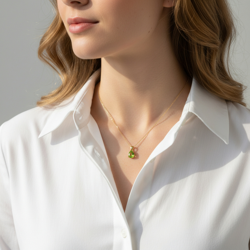Pour ajouter une petite touche de couleur à votre haut, choisissez cet agréable pendentif. Il insufflera une note de fraîcheur à vos tenues et ne manquera pas briller à votre cou. Il est constitué d'une monture en or jaune et d'un péridot en forme de poire. La monture est composée d'une bélière en triangle avec les bords arrondis et un corps à quatre griffes qui reçoit la pierre. Le péridot dans sa coquette robe acidulée n'attend plus que d'agrémenter votre collier.
