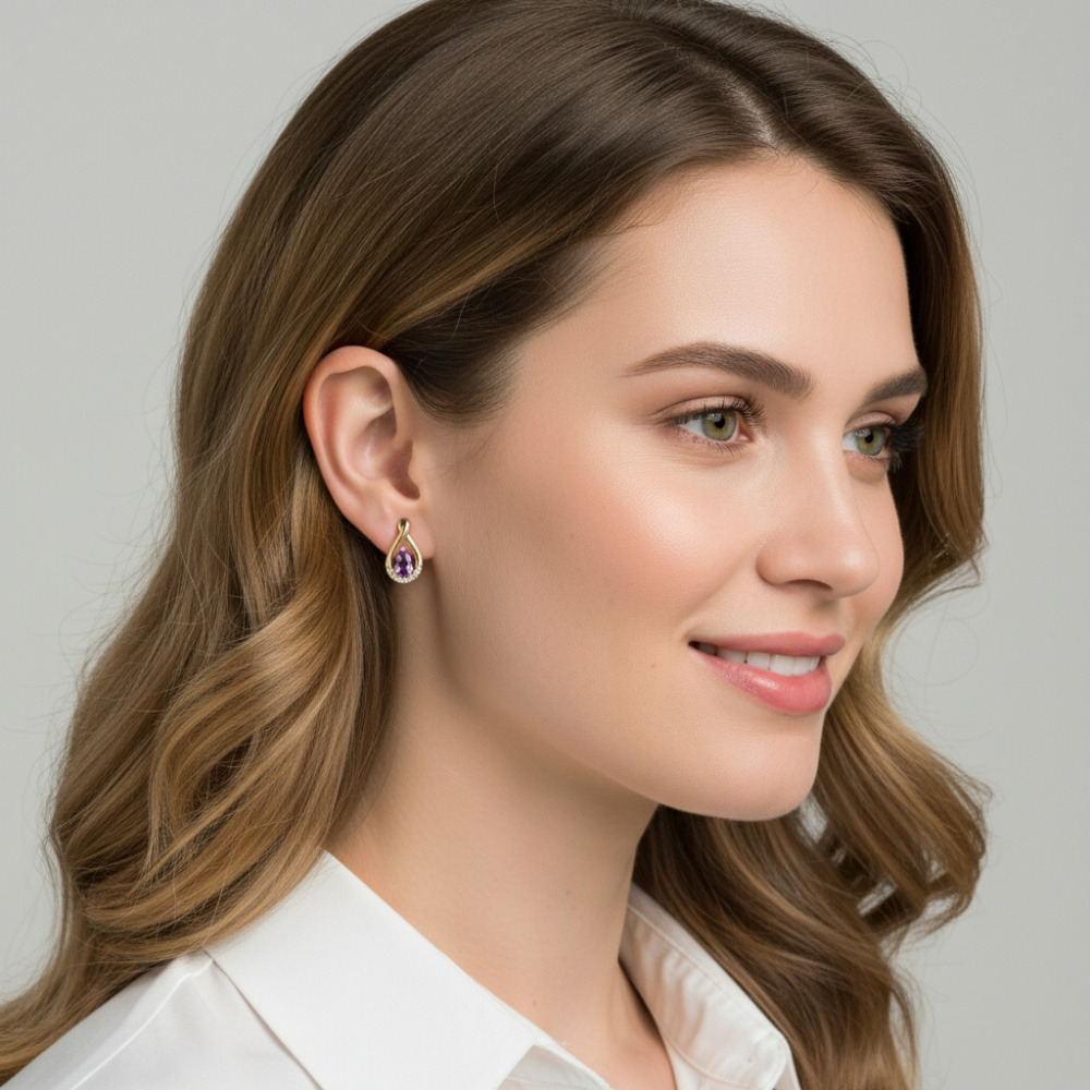 Vous aimez les boucles d'oreilles de style pendant, celles-ci vous conviendront. Elles présentent des petits motifs pendants avec une améthyste pour les orner. La pierre est taillée en poire et elle trouve place au centre du motif. Elle est fixée par trois griffes et sa note colorée s'accorde parfaitement avec la monture en or jaune qui l'accompagne. Chaque motif est joliment orné d'un petit diamant, serti au bas de monture. Ces bijoux sont munis de poussette comme système de fermeture et ils ne manqueront pas de briller de tout leur éclat à vos oreilles.