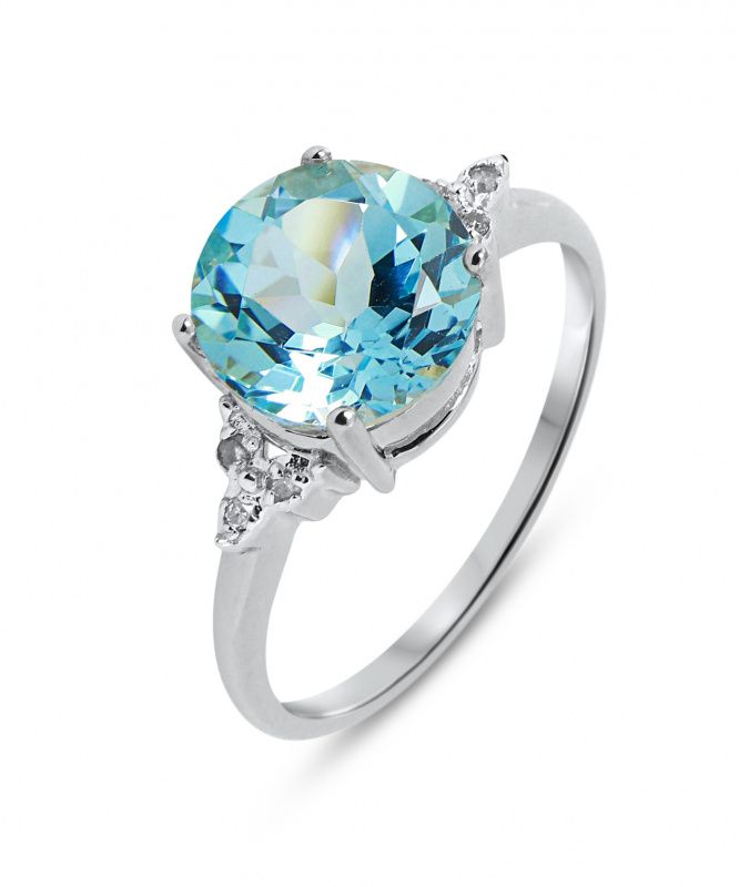 Bague Or blanc 375 Topaze Bleue traitée Ronde 9mm et Diamant
