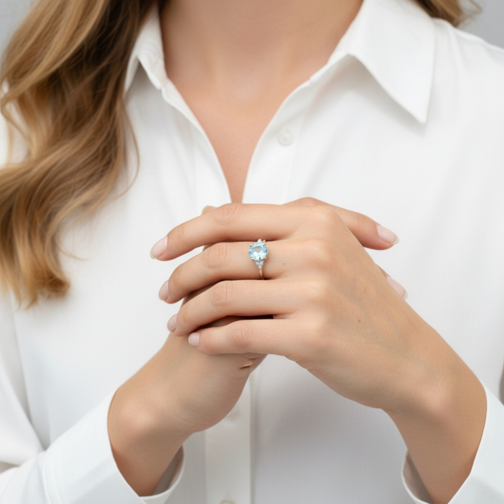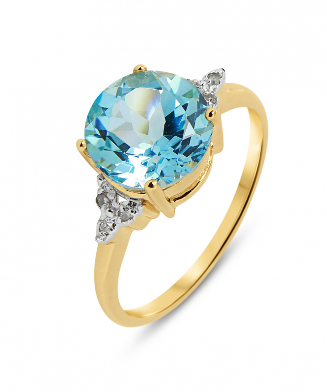 Bague Or jaune 375 Topaze Bleue traitée Ronde 9mm et Diamant