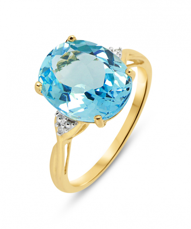 Bague Or jaune 375 Topaze Bleue traitée Ovale 12x10mm et Diamant