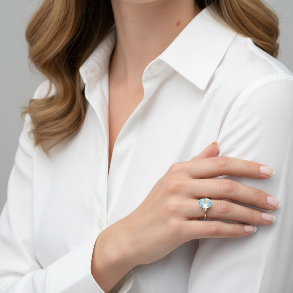 Cette belle bague est composée d'un motif principal agrémenté par une topaze bleue traitée. La pierre est de forme ovale et elle se distingue par sa forme imposante. Elle est montée sur un corps à quatre griffes, grâce à ce type de sertissage, la pierre est mise en hauteur et donc mise en avant pour apporter une note colorée. L'anneau est en or jaune, il dessine une forme régulière avec une épaule sur le haut. Des petits diamants viennent prendre place de chaque côté de la pierre centrale pour un effet plus brillant.