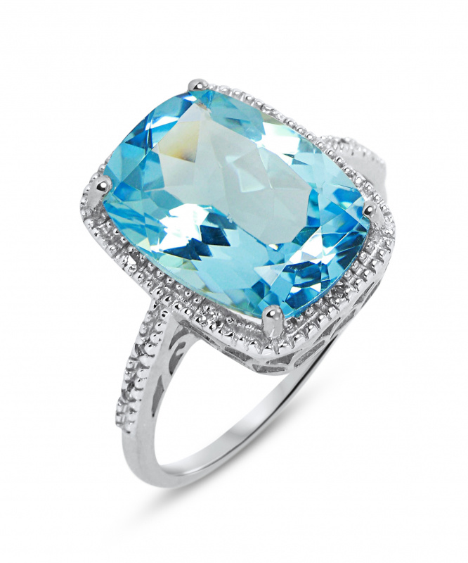 La topaze bleue traitée ne pouvait qu'être accompagnée par une monture en or blanc sur cette bague. Sa couleur est d'une telle beauté et elle est relevée par la tonalité claire qui l'entoure. En effet, elle est entourée par une dizaine de diamants. La topaze traitée représente la pierre principale de ce bijou, elle est taillée en coussin avec une forme rectangulaire et elle est montée sur un corps à quatre griffes. Pour encore plus d'authenticité, le corps maintenant la pierre est pourvu de motif ajouré comme sur les épaules. Ces dernières ont la particularité d'être ornées par des diamants.