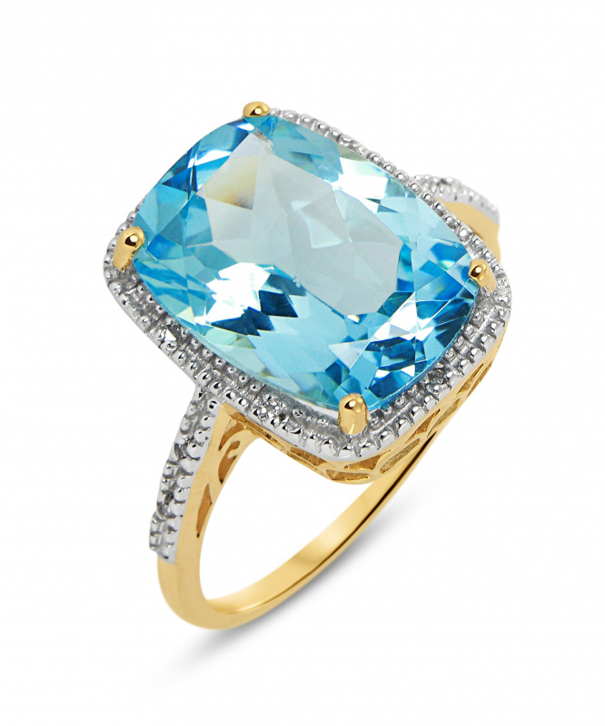 Bague Or jaune 375 Topaze Bleue traitée Coussin 14x10mm et Diamant