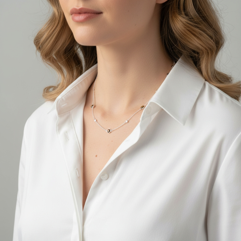 Pour rehausser votre haut, choisissez ce collier. Il se distingue par sa belle monture constituée d'une chaîne forçat décorée de multiples pierres. Au total,onze pierres dont cinq oeil de tigre et six oxydes de zirconium ornent le collier. Les pierres sont de forme ronde et l'oeil de tigre est taillé en plusieurs facettes. La disposition des pierres est alternée ainsi, la belle tonalité de l'oeil de tigre met en valeur la chaîne en argent ainsi que les oxydes de zirconium à la couleur transparente.