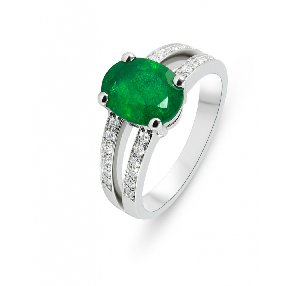 Bague en Or Blanc 750 sertie d'une émeraude ovale et de diamants
