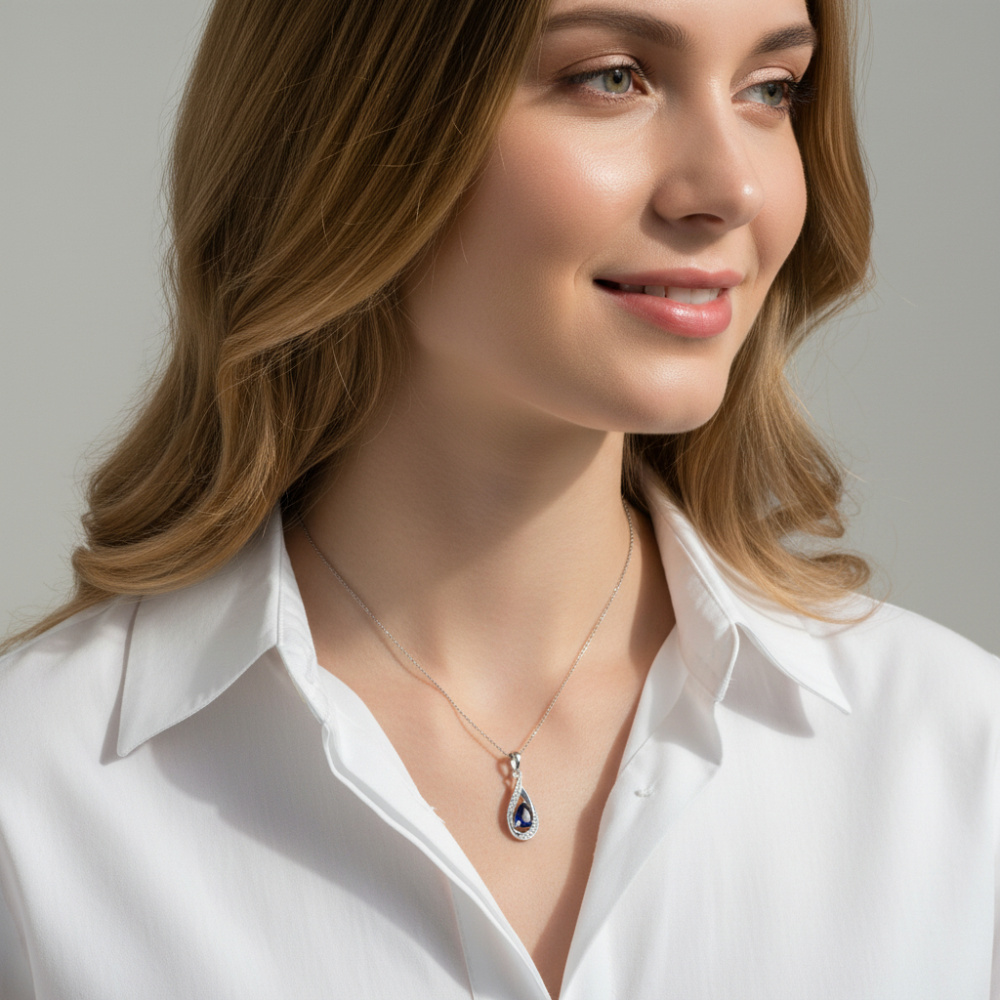 Pendentif Or Blanc 750 Saphir poire de 6x4mm et Diamants