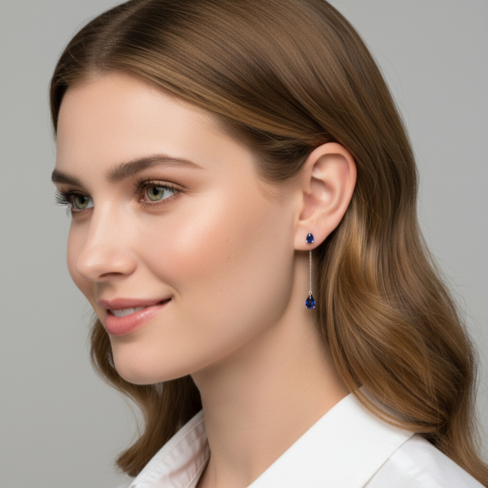 À l'occasion d'une soirée ou d'un événement spécial, brillez de mille feux avec cette paire de boucles d'oreilles en or blanc 750. Le bijou se pare d'un sublime duo de saphirs bleu intense et mystérieux, taillés en poire et fixés par un serti à griffes. La première pierre agencée en puces d'oreilles est connectée à un fermoir à poussette belge. Ce dernier est soudé à une chaînette en maille forçat qui accueille à son extrémité un second saphir plus grand.