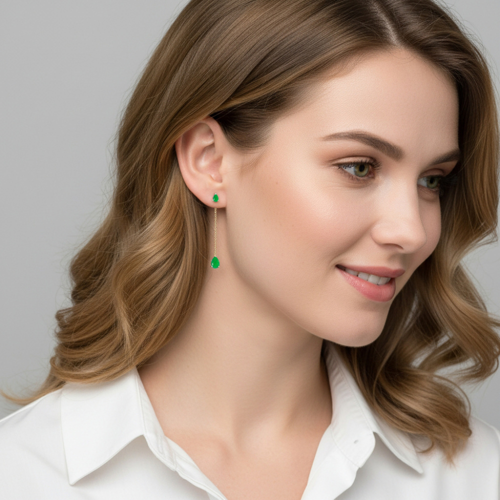 Ces boucles d'oreilles de style pendant connaissent un vif succès grâce à leur pouvoir d'affiner les visages ronds. La belle pièce de joaillerie est ornée d'un duo d'émeraudes mis en valeur de manière originale sur la monture. La première pierre fixée sur la puce d'oreilles par un serti à griffes est achevée par une poussette belge. Le fermoir est soudé par une chaîne en or faite de maille forçat qui est ornée d'une autre émeraude à son extrémité. Le style moderne et aérien de ce bijou plaira certainement à toutes les femmes.