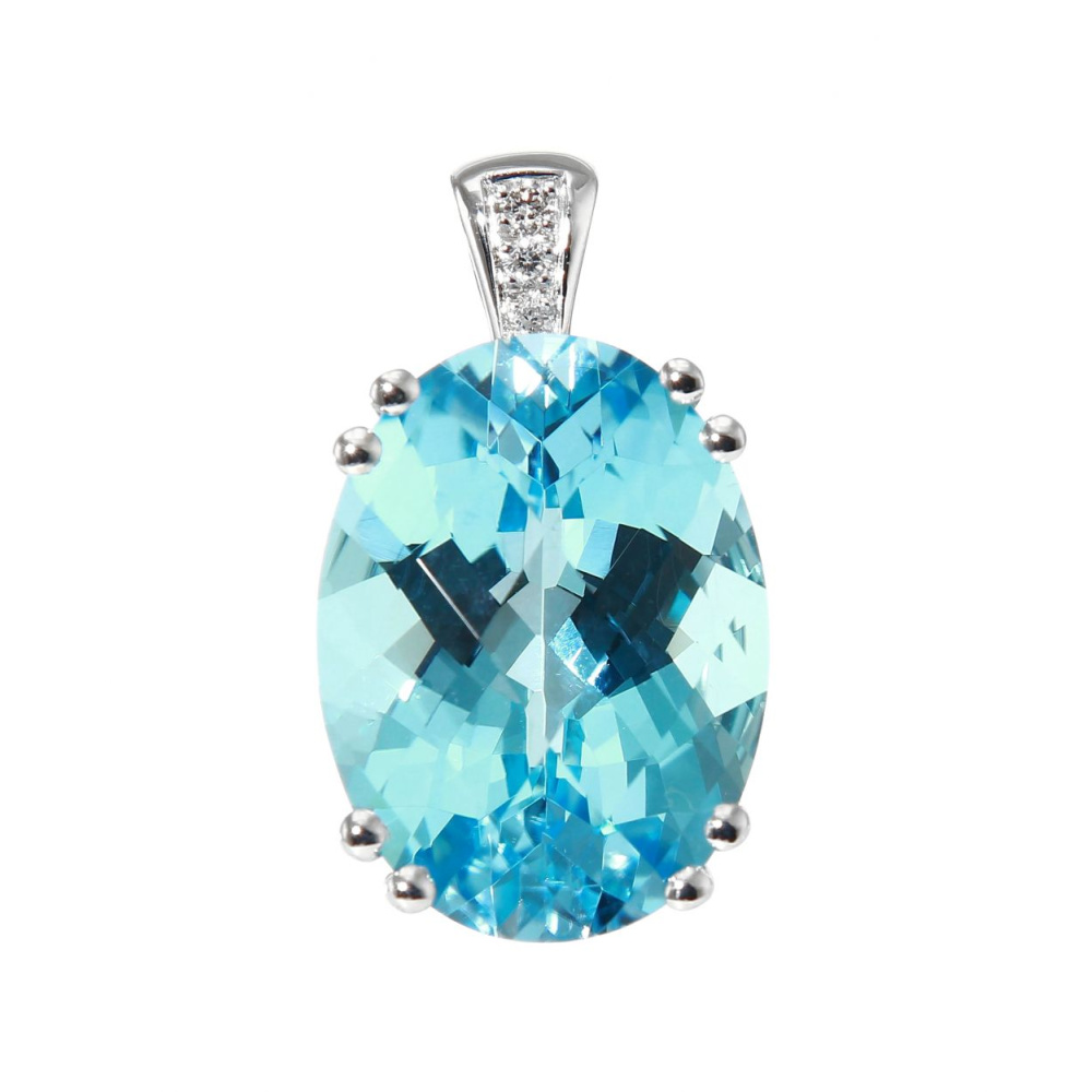 Pendentif en Or Blanc 750 serti d'une Topaze Bleue traitée ovale de 16x12mm (10,6 carats) et de 3 diamants