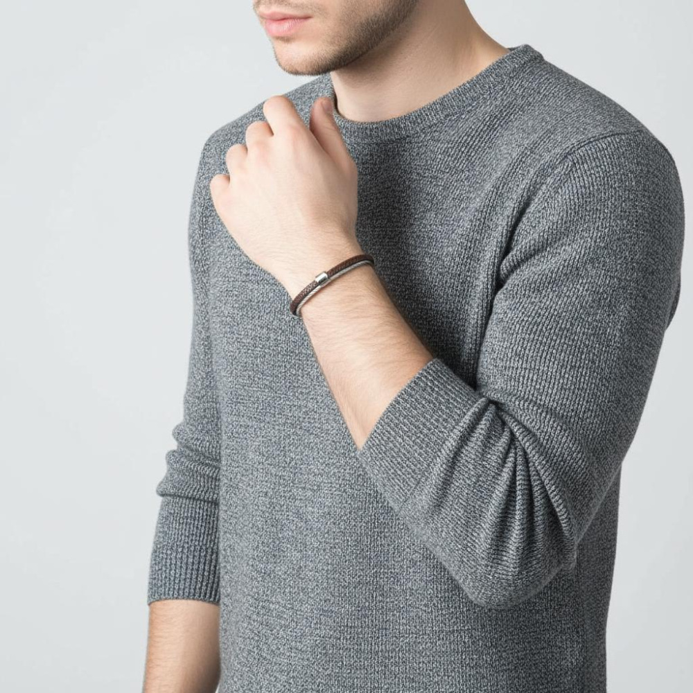 Les hommes qui souhaitent agrémenter leur poignet d'un bijou élégant et facile à vivre opteront pour ce bracelet. Nos bijoutiers lui ont choisi un design bi-matière très équilibré. L'acier est façonné sous la forme de trois cordes que vient agrémenter une lanière de matière synthétique tressée. La couleur marron de celle-ci ressort bien avec l'éclat du métal. D'autant que le bijou présente encore trois barrettes en acier pour souligner l'ensemble. Se refermant par un système à clip déployant, le bracelet est facile à ajuster et sa largeur vous autorise à l'accorder à un autre bijou plus fin.