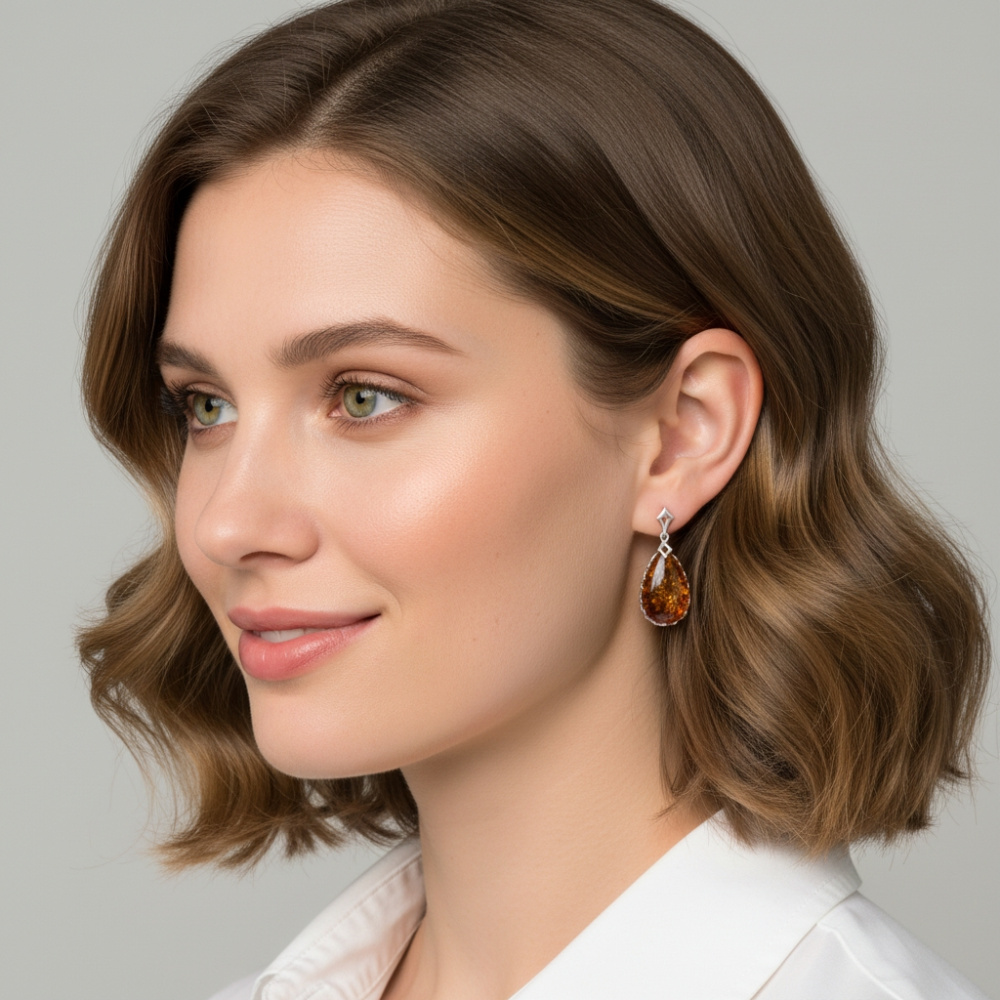 Boucles d'oreilles pendantes en argent avec une ambre en forme de poire de 14x22mm