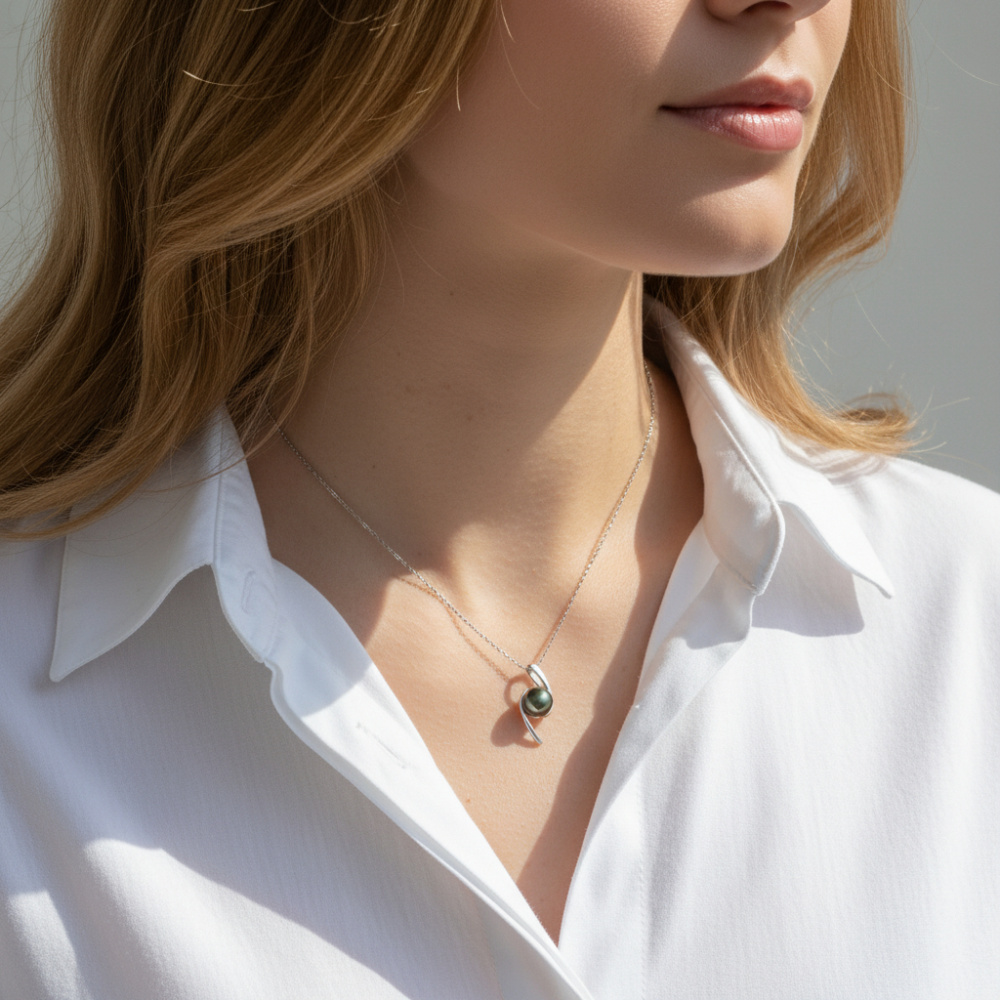 Le reflet vert bouteille de la perle de culture de Tahiti sertissant ce pendentif est exquis dans le motif simple qui maintient le minéral. Il s'agit d'un serti rond prolongé, de part et d'autre, par deux petits arcs d'or blanc 750. L'un des arcs constitue, en même temps, la bélière sur ce pendentif que vous pourrez porter aussi bien avec un ras-de-cou qu'une chaîne. Le bijou s'accordera à merveille avec des pendants d'oreilles à crochet ou des dormeuses serties du même minéral. Les détails du serti seront bien mis en valeur avec une robe taillée dans un tissu moiré aux nuances olivâtre.