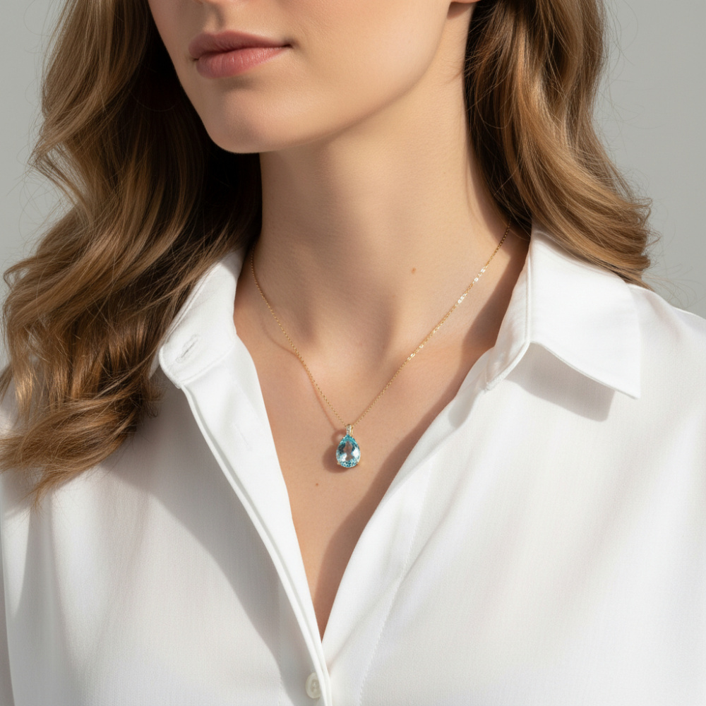 Le bijou accueille en son coeur une magnifique topaze bleue traitée facettée et taillée en poire.