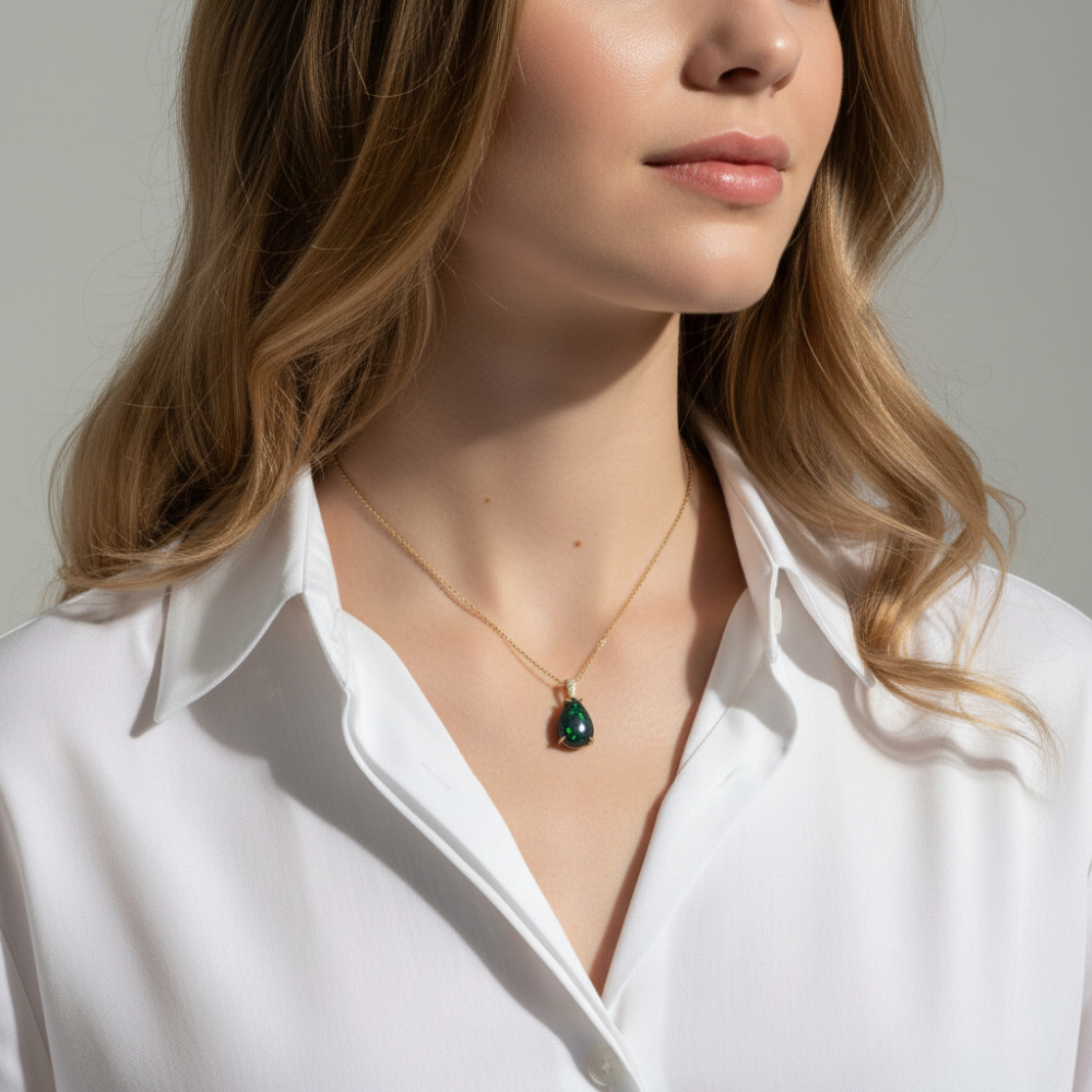 Venant rayonner sur la peau de sa propriétaire, ce pendentif en or jaune attire tous les regards par ses détails précieux. Il est effectivement sublimé par une opale taillée en cabochon et en poire qui attise la curiosité par ses profonds reflets noirs. La pierre fine est maintenue par quatre griffes sur la monture surmontée d'une bélière incrustée de trois diamants discrets.