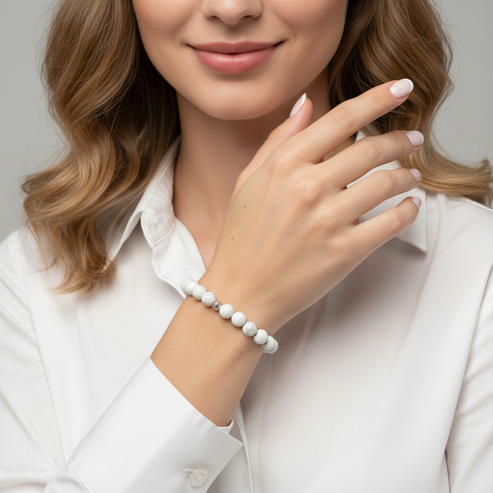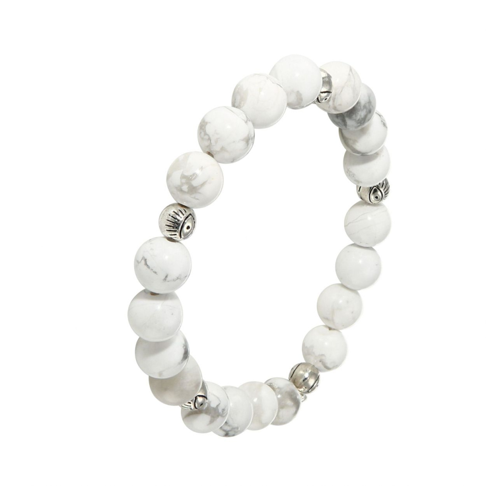 Pour adoucir vos tenues vestimentaires et les rendre encore plus élégantes, ce bracelet deviendra votre accessoire de mode fétiche. Il tire toute son esthétique des vingt perles de howlite qui ont été fixées sur un élastique souple et agréable à porter. Quelques intercalaires en forme d'oeil viennent rompre la monotonie d'une simple suite de pierres.