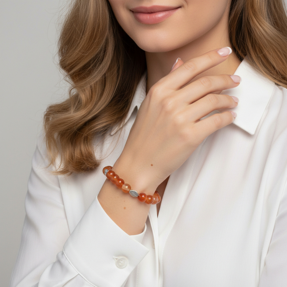 Apportez une touche de couleur dynamique à une tenue vestimentaire trop sobre avec ce bracelet. En plus d'accessoiriser votre look avec goût, il s'agit aussi d'un porte-bonheur. En effet, le bijou est orné de vingt perles de cornaline ainsi que de motifs métalliques représentant des feuilles.