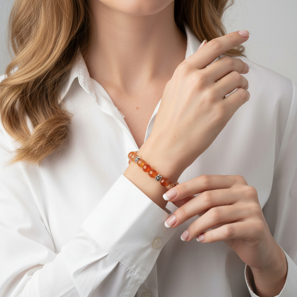 Ce Bracelet est composé de 20 perles de 8mm en Cornaline et de 5 intercalaires en métal représentant une fleur