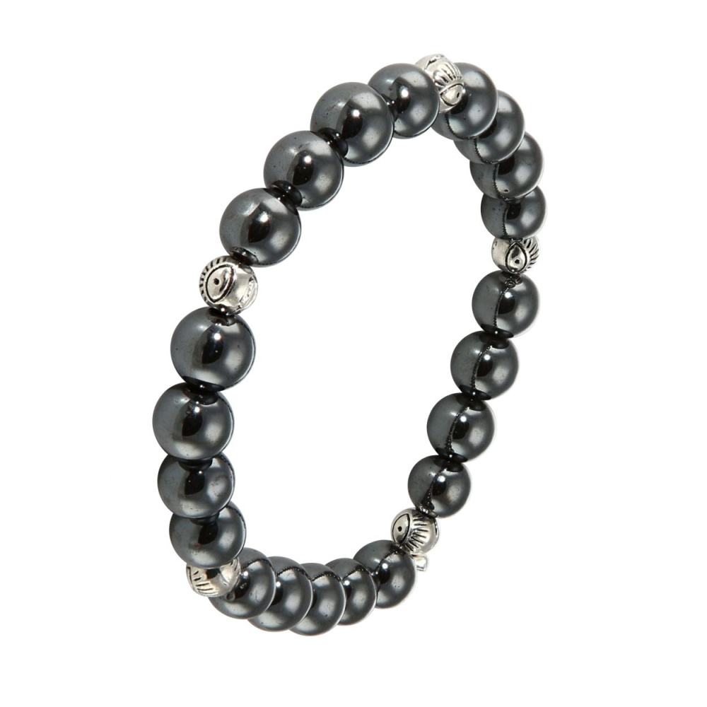 Ce Bracelet est composé de 20 perles de 8mm en Hematite et de 5 intercalaires en métal représentant un oeil porte bonheur