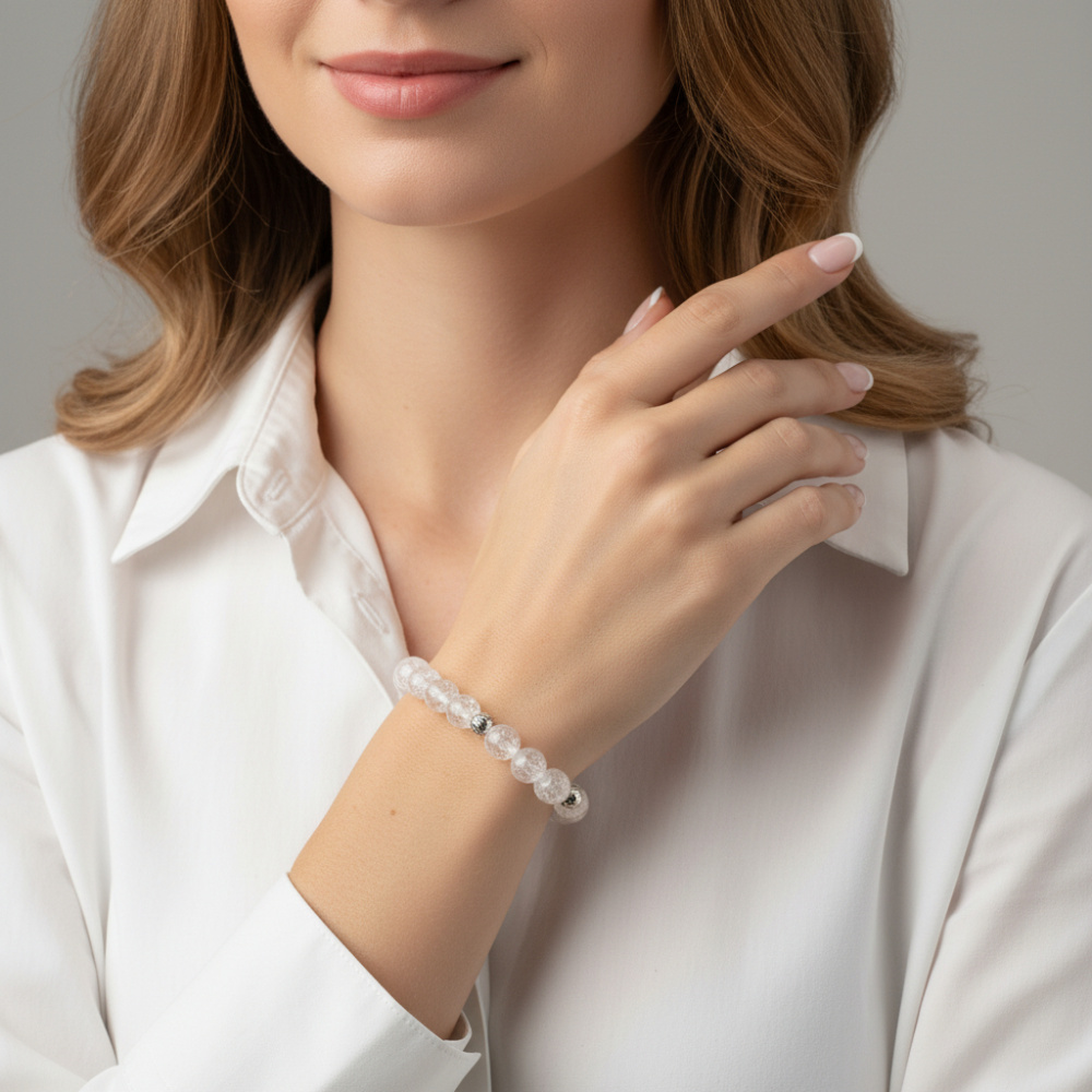Pour attirer les regards sur chacun de vos gestuels, ce bracelet deviendra votre meilleur allié. Le bijou est orné de vingt perles de cristaux de roche d'une blancheur et d'une limpidité exemplaire. Grâce à la pureté de ses lignes et de son apparence, le cristal de roche apporte une véritable valeur ajoutée à ce bracelet qui est également composé de quelques motifs en forme d'oeil métallique en guise de porte-bonheur.