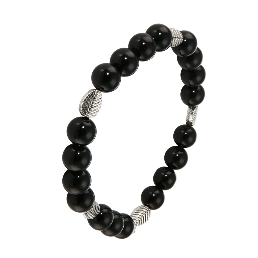 Ce bracelet pour femme attire irrémédiablement l'?il par ses profondes couleurs mystérieuses. Il est effectivement embelli par 20 perles d'onyx à la couleur noire énigmatique. Des intercalaires en forme de feuille métallique ornent également ce bijou hors du commun.
