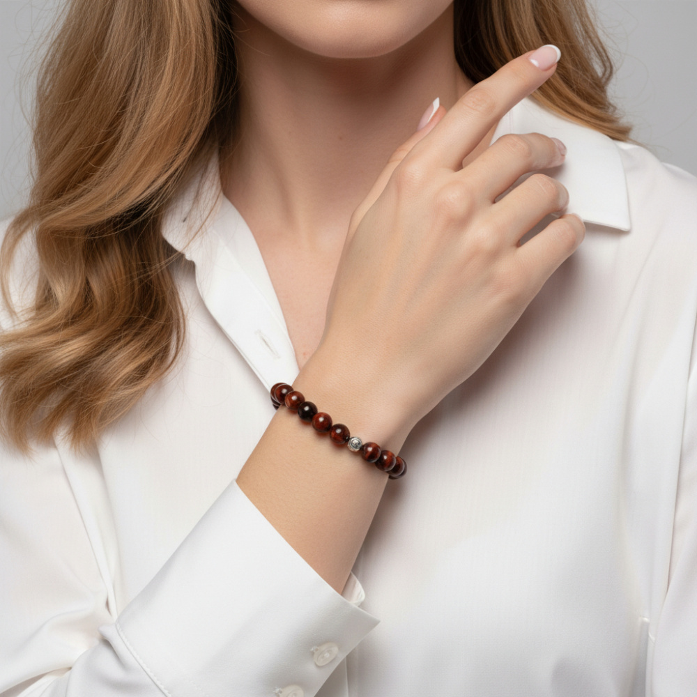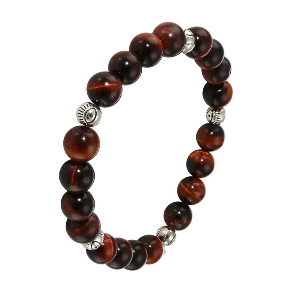 Faites de la place dans votre boîte à bijoux pour ce magnifique bracelet à l'aura naturelle. Le bijou est sublimé par 20 perles d'?il-de-taureau appréciées pour leur tonalité rouge à brun. L'esthétique du bijou est rehaussée par les intercalaires en forme d'?il également enfilés sur l'élastique.