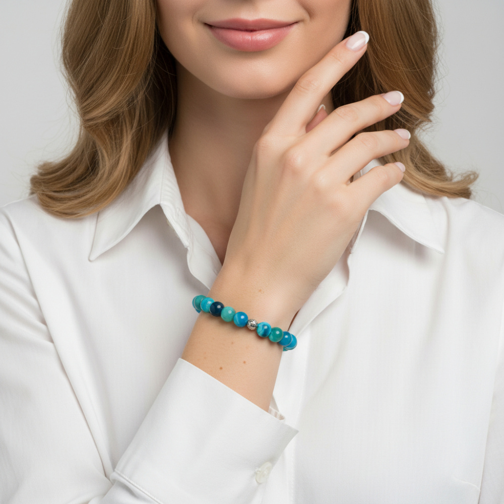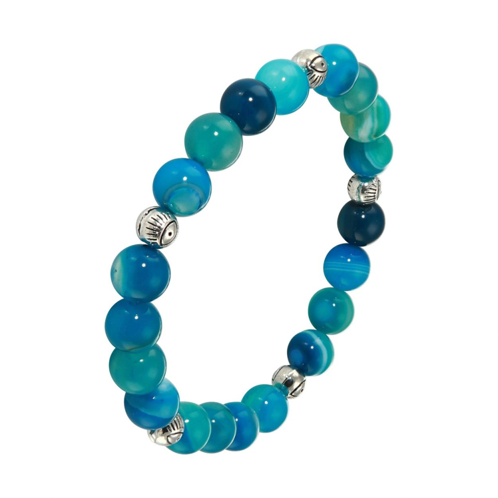 Dévoilant beaucoup d'élégance et de personnalité, ce bijou est l'idéal si vous désirez un look hors du commun. Il est délicieusement orné de vingt agates bleues lisses, brillantes et rondes qui jouent le rôle de porte-bonheur. Effectivement, les pierres serviraient à lutter contre les problèmes quotidiens et aideraient à éviter les blocages énergétiques et les chutes. Elles ont été enfilées sur un fil en élastique facile et confortable à porter puis sont alternées avec des motifs en forme d'oeil.