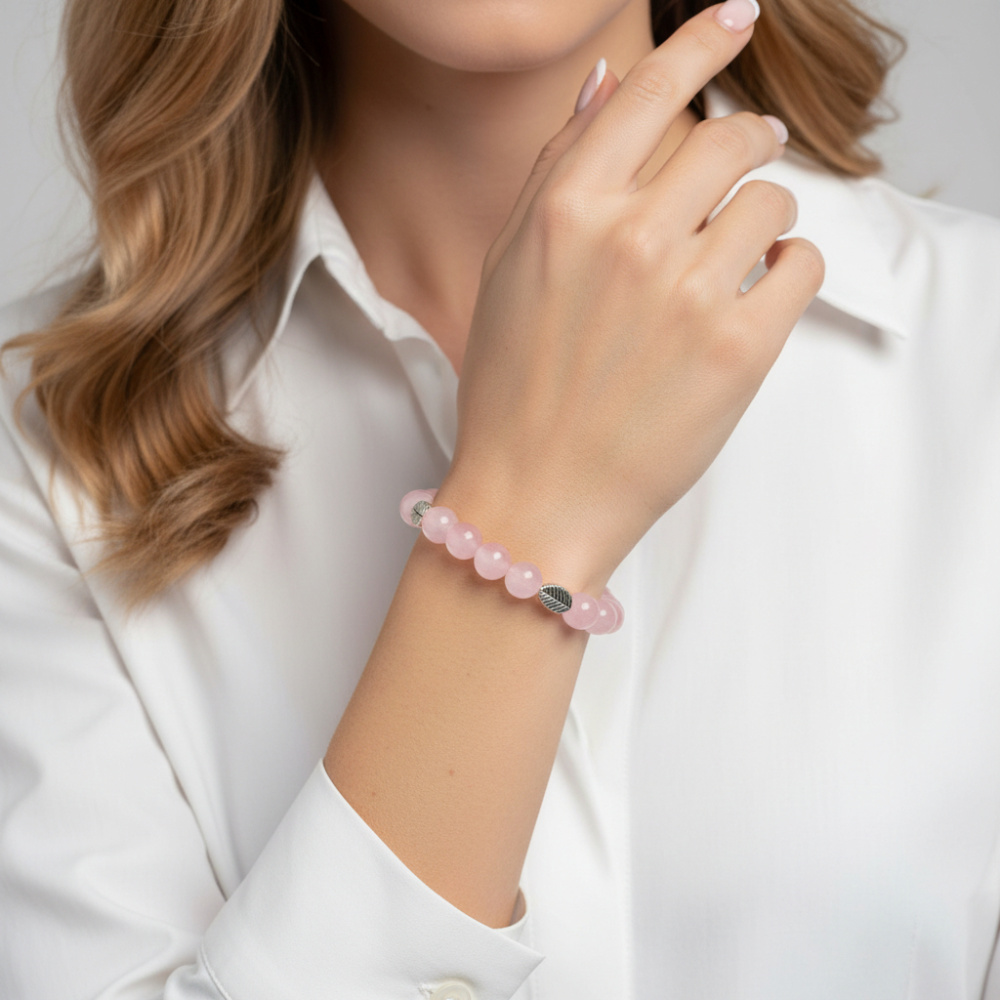 Bracelet Quartz Rose 8mm et Motif Feuille