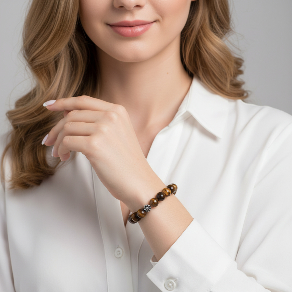 Bracelet Oeil de tigre 8mm et Motif Fleur