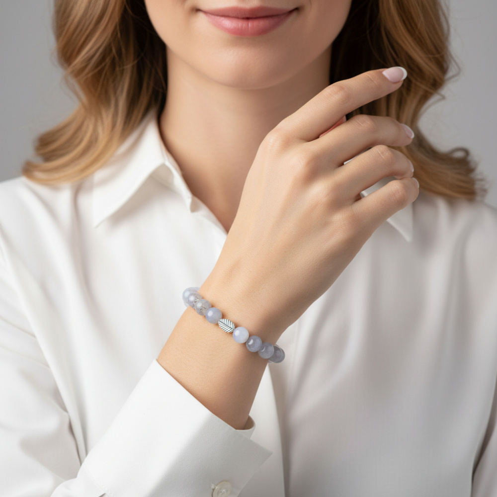Ce Bracelet est composé de 20 perles de 8mm en Calcédoine Bleue et de 5 intercalaires en métal représentant une feuille