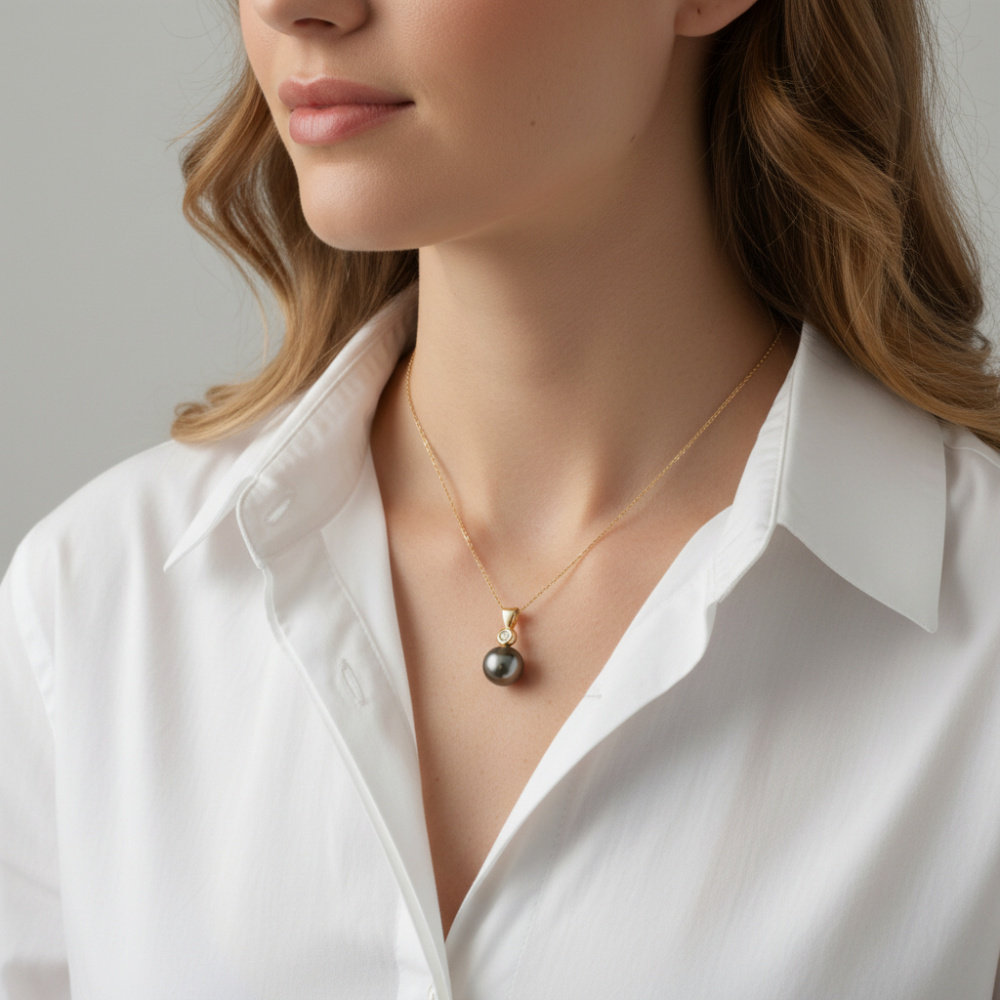Une douce association de poésie et de raffinement s'échappe de ce pendentif en or jaune. Le bijou plait pour son style discret et intemporel procuré par la perle de culture de Tahiti. La parfaite forme ronde de ce minéral rappelle les belles courbes féminines. Sa couleur sombre joue aussi sur son élégance. Pour accentuer la beauté du bijou, un diamant blanc a été ajouté au sommet de la monture et a été fixé dans un filet de métal précieux assez épais.