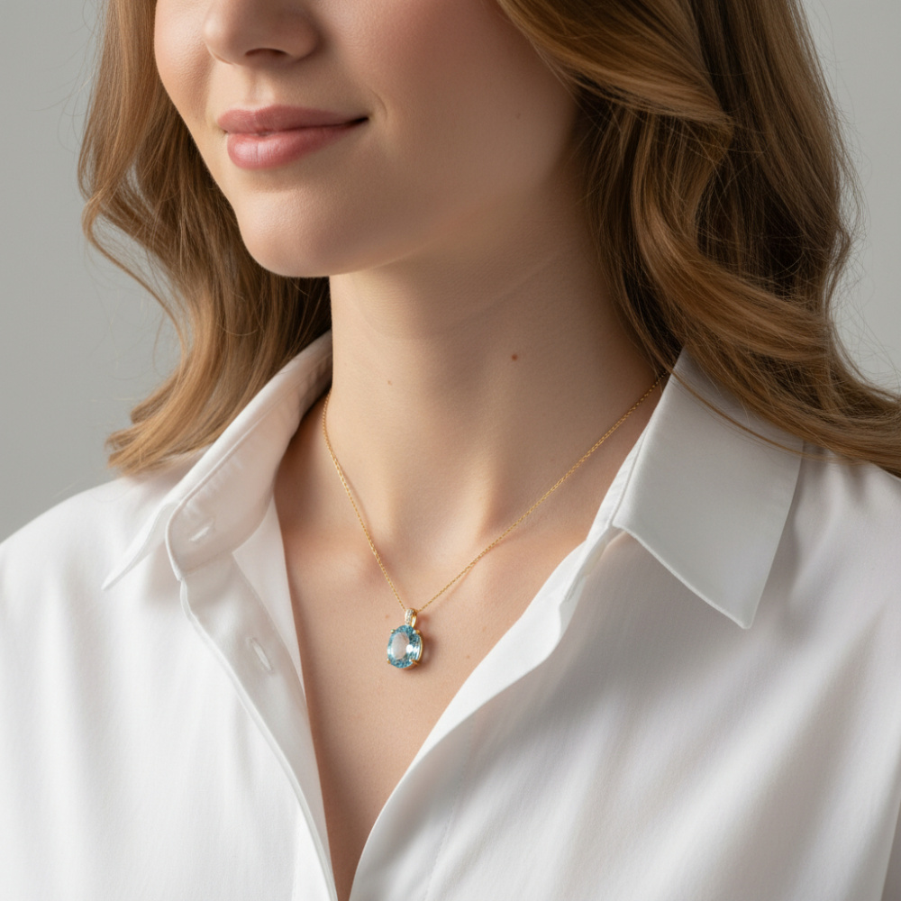 Pendentif en Or Jaune 750 serti d'une Topaze Bleue traitée Ovale de 12x10mm et de 3 diamants