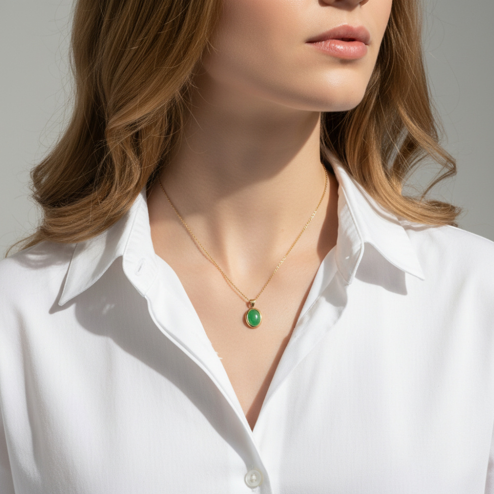 Ce pendentif en or jaune ne fait qu'un avec la peau de ces dames. Véritable symbole d'élégance et de charme, le bijou est sublimé par une pierre de jade ovale et taillée en cabochon qui s'illustre par la pureté de ses lignes. La pierre fine attire l'attention par ses douces couleurs vertes qui rappellent le retour du printemps. Elle est mise en valeur dans un beau serti-clos qui la protège contre les chocs et les rayures.