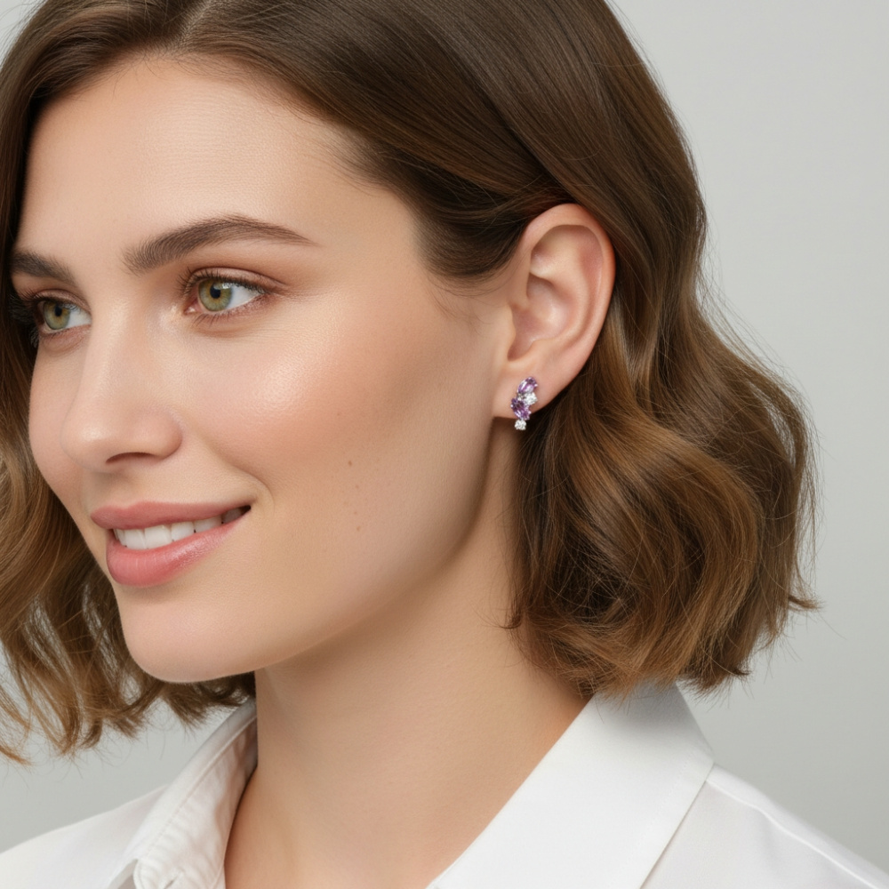 Boucles d'oreilles Double Duo en Argent 925 Rhodié Améthyste et Oxydes