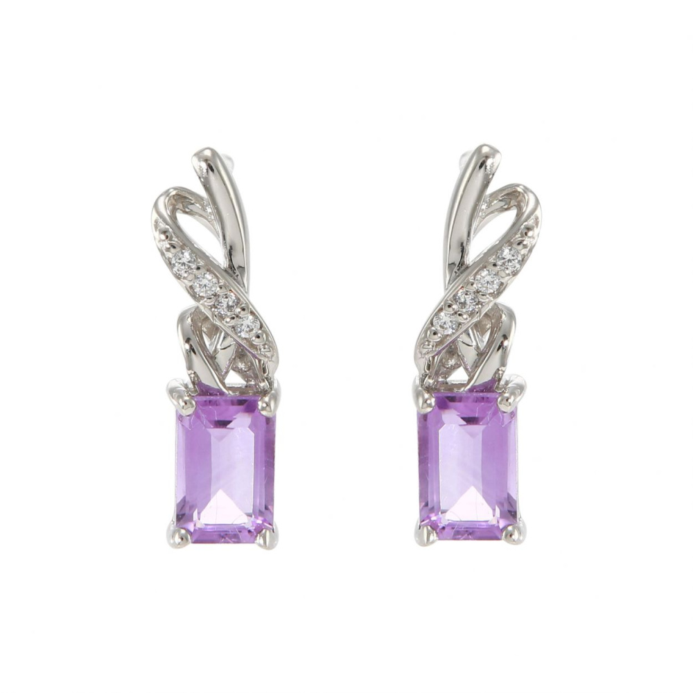 Dans une jolie symphonie de couleurs et de matières, cette paire de boucles d'oreilles en argent 925 sublimera votre allure au quotidien. Le bijou dégage une expression de modernité et d'audace par son motif entrelacé inspiré de l'art abstrait. L'argent est mis en scène de façon poétique puis a été embelli de plusieurs oxydes de zirconium blancs. La partie inférieure est sertie d'une améthyste rectangulaire fixée par quatre griffes. La pierre fine dévoile une belle couleur lilas qui confère un air frais et élégant au bijou.