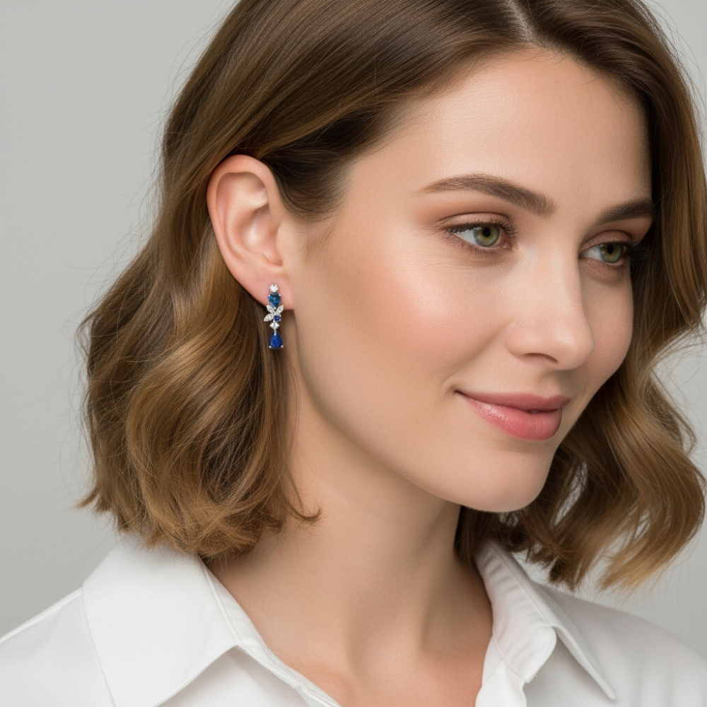 Capturant le regard par ses reflets hypnotisant, cette paire de boucles d'oreilles en or blanc mérite amplement sa place dans votre collection de bijoux. Elle est sublimée par une série de pierres précieuses alignées sur la longueur pour donner un style pendant au bijou. Vous serez ébloui par l'éclat des saphirs bleus taillés en poire qui s'alternent avec des diamants. D'autres saphirs ronds plus petits égayent la monture et s'accompagnent de feuilles de diamants.