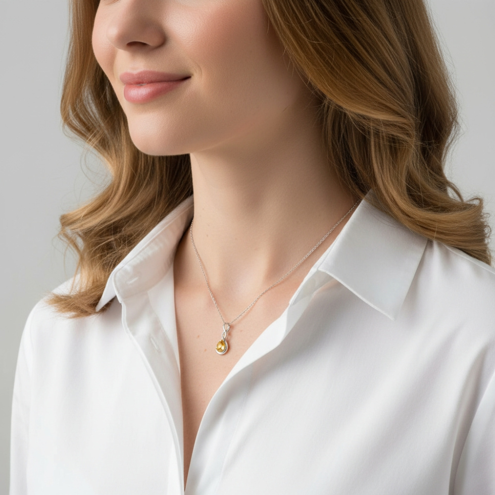 Considéré comme l'un des symboles les plus explicites pour exprimer ses sentiments, ce pendentif évoque l'infini dans sa plus belle expression. Fait d'argent 925, le bijou porte la marque de l'amour éternel, c'est pourquoi il fait un cadeau idéal pour un être cher. Il est orné de trois boucles dont deux sont ornées d'une citrine taillée en poire ainsi que d'un oxyde de zirconium blanc. La troisième boucle sert de bélière pour accueillir la chaîne de cou.