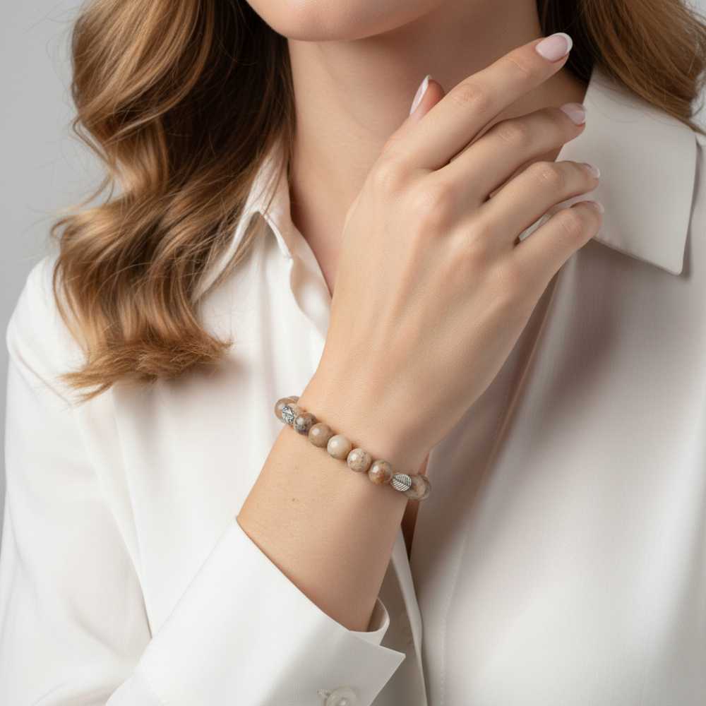 Bracelet Opale Dendritique 8mm et Motif Feuille