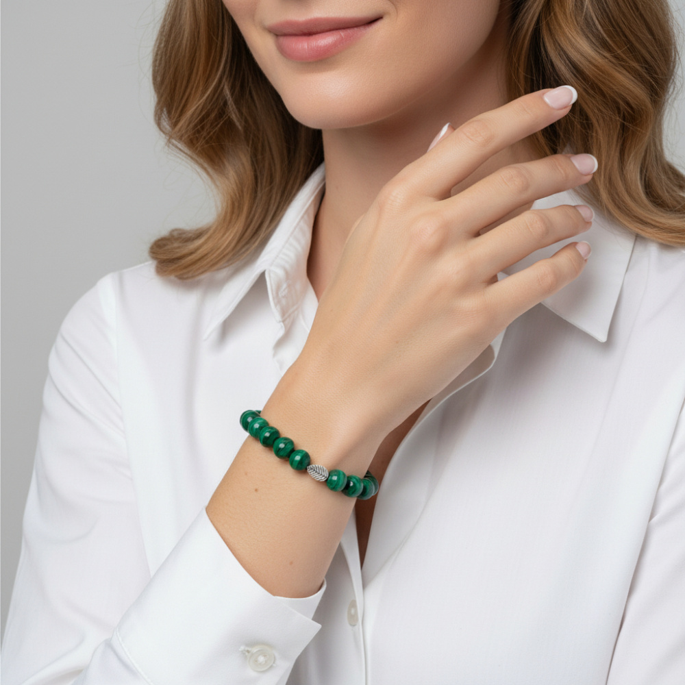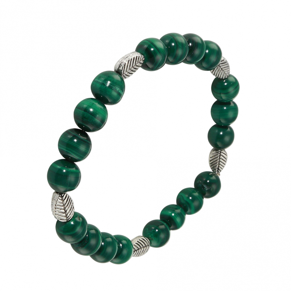 Ce Bracelet est composé de 20 perles de 8mm en Malachite et de 5 intercalaires en métal représentant une Feuille