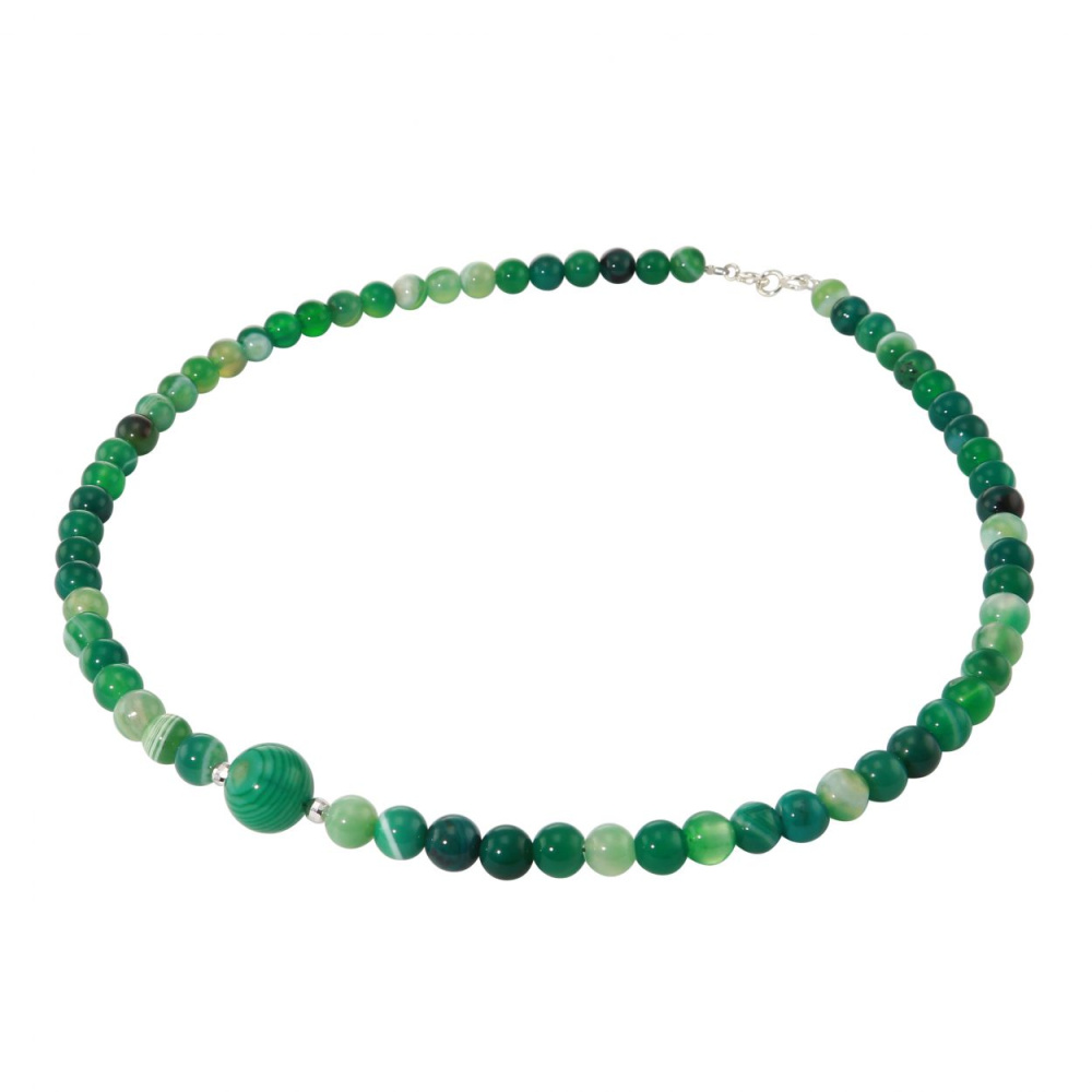 Ce collier est composé de boules de 6mm en Agate Verte, de 2 perles facettées en Argent de 4mm de diamètre et d'une perle 10mm en agate en son centre