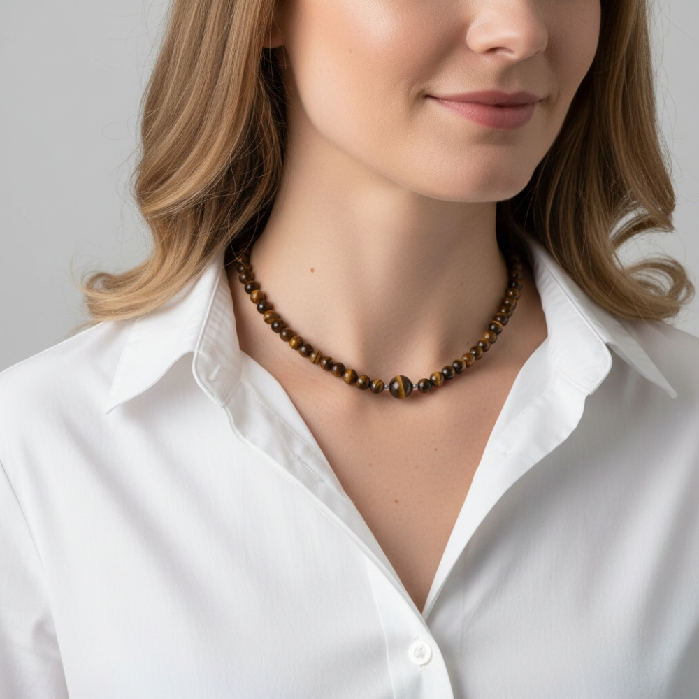 Pour parfaire vos looks au quotidien, sélectionnez ce splendide collier pour femme révélant une aura moderne et originale. Le bijou est réalisé à partir d'une série de perles d'oeil-de-tigre qui parsèment l'ensemble du câble en acier refermé par un anneau à ressort en argent. Les pierres fines sont remarquables par leurs nuances jaunes dorées à marron et par leur effet de chatoyance. Pour la touche décorative, une perle d'oeil-de-tigre plus grande orne le centre du collier.