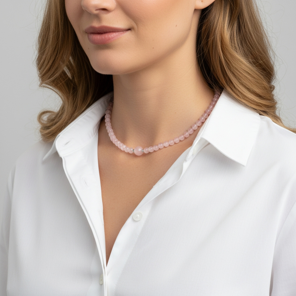 Ce collier est composé de boules de 6mm en Quartz Rose, de 2 perles facettées en Argent de 4mm de diamètre et d'une perle 10mm en Quartz Rose en son centre